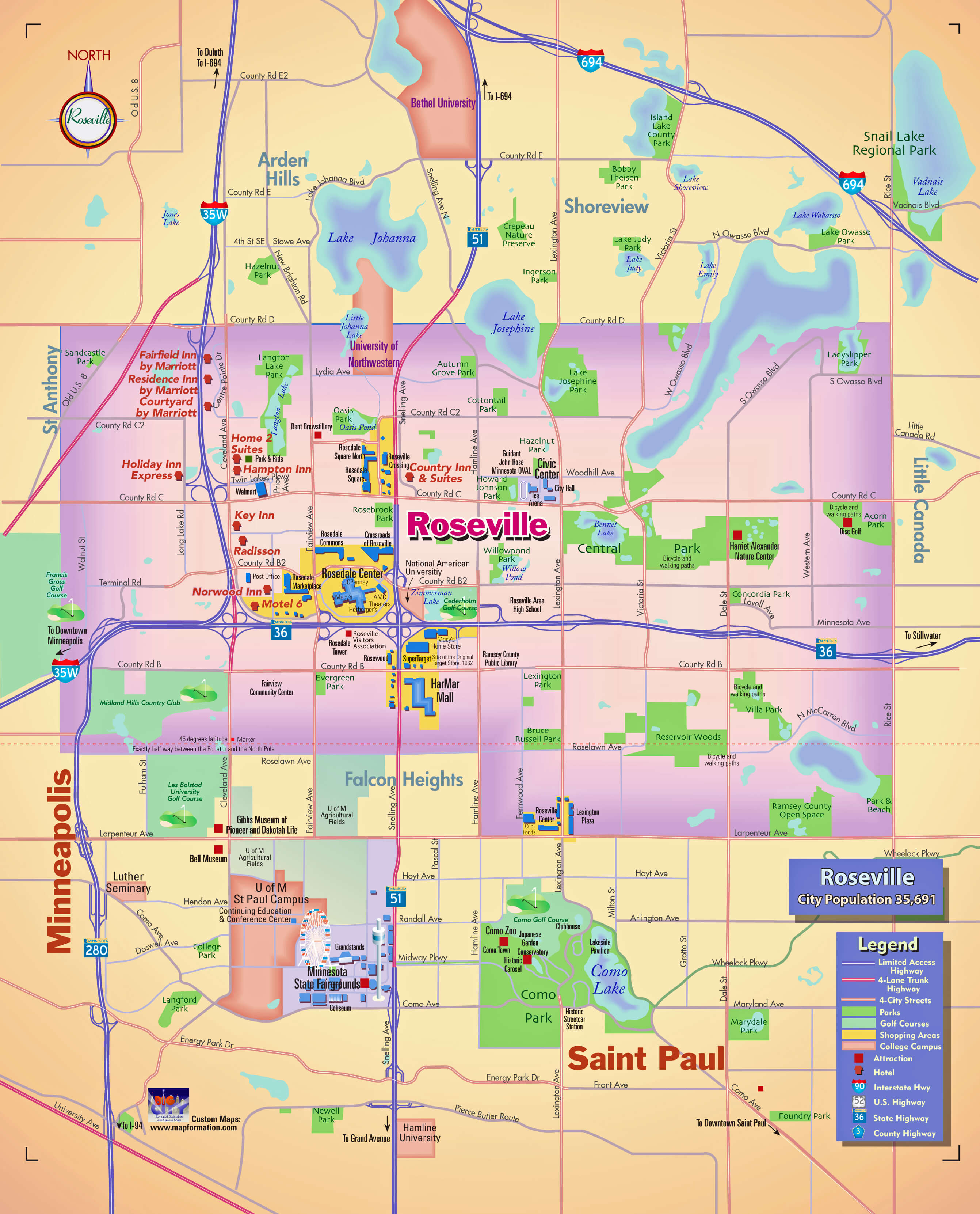 Whether you’re arriving by car, train or plane, Roseville’s central location in the Minneapolis and Saint Paul area puts you in the center of the excitement. Use our maps and directions to help plan your next trip to the Twin Cities.
